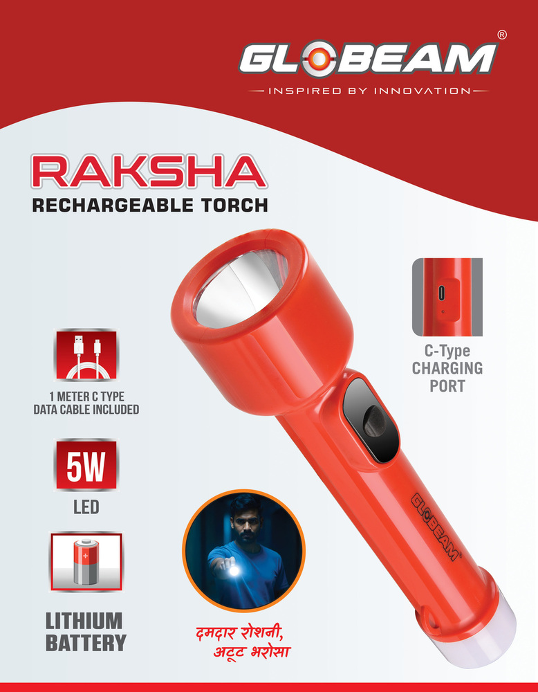 The Globeam Raksha Rechargeable Torch is an innovative lighting solution designed for domestic use. Powered by a 1200 mAh rechargeable battery, this torch ensures long-lasting illumination with a highly efficient LED light source. The torch emits bright white light, making it ideal for varied indoor and outdoor situations. Crafted with strong ABS plastic, the robust body offers durability, even under regular usage. Designed for convenience, the manual switch allows effortless operation, ensuring quick access to reliable lighting whenever needed. Whether for household chores or emergency use, this torch offers dependable performance backed by a sturdy build and energy-efficient rechargeable power.